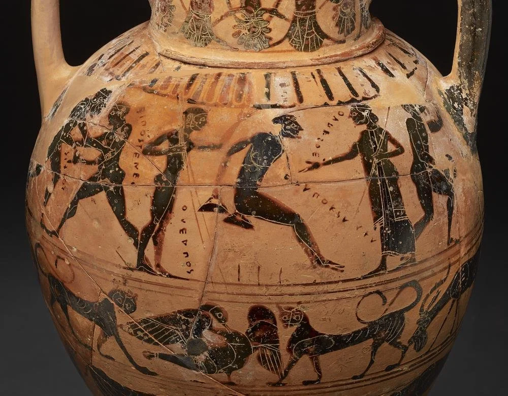 A competitor in the long jump in the center, with athletes wrestling to the left. Tyrrhenian amphora, 540 BC. British Museum.
